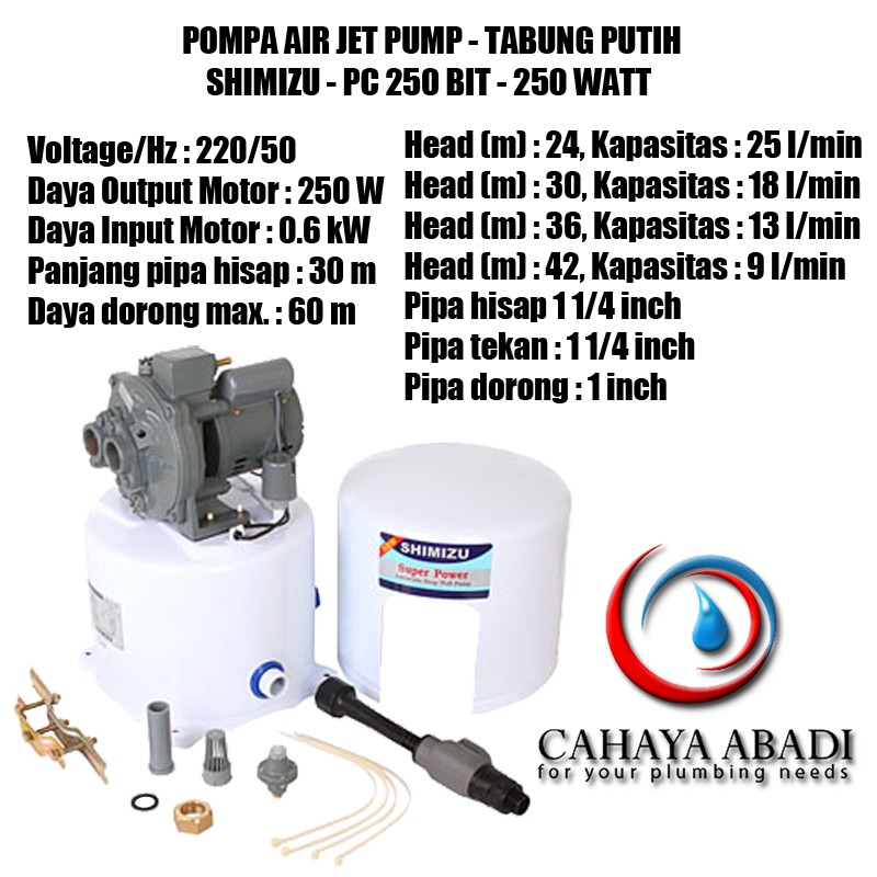 1.25 inch in, 1 inch push, 1 inch out. Pada ujung pipa hisap memiliki mata jet / ejektor yang berfungsi menambah daya dorong pompa, sehingga mampu menghisap dan mendorong air lebih tinggi. Harga pompa air jet pump dan spesifikasi lengkap sanyo shimizu wasser dab hitachi panasonic national grundfos. Shimizu pc 250 bit pompa air jet pump. Tangki mesin pompa air jet pump shimizu pc 250 bit tabung bawah dea.